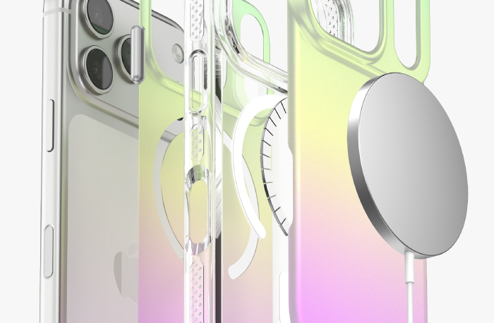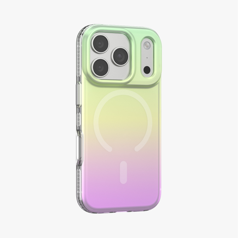 The P-25033 introduces the next evolution of style and protection with its third-generation gradient electroplating technology. Featuring an acrylic backplate that captures flowing metallic hues, it delivers a dynamic color-shift finish that changes gracefully with every angle — modern, vibrant, and unmistakably premium. Built with MagSafe-compatible wireless magnetic charging, the case ensures seamless power connection without compromising its sleek profile. The transparent TPU frame with subtle white micro-dots enhances grip while maintaining clarity and durability. Through precision electroplating and seamless bonding processes, each surface achieves a refined metallic gradient with superior scratch resistance and lasting brilliance. The P-25033 is more than protection — it’s a statement of sophistication and motion.