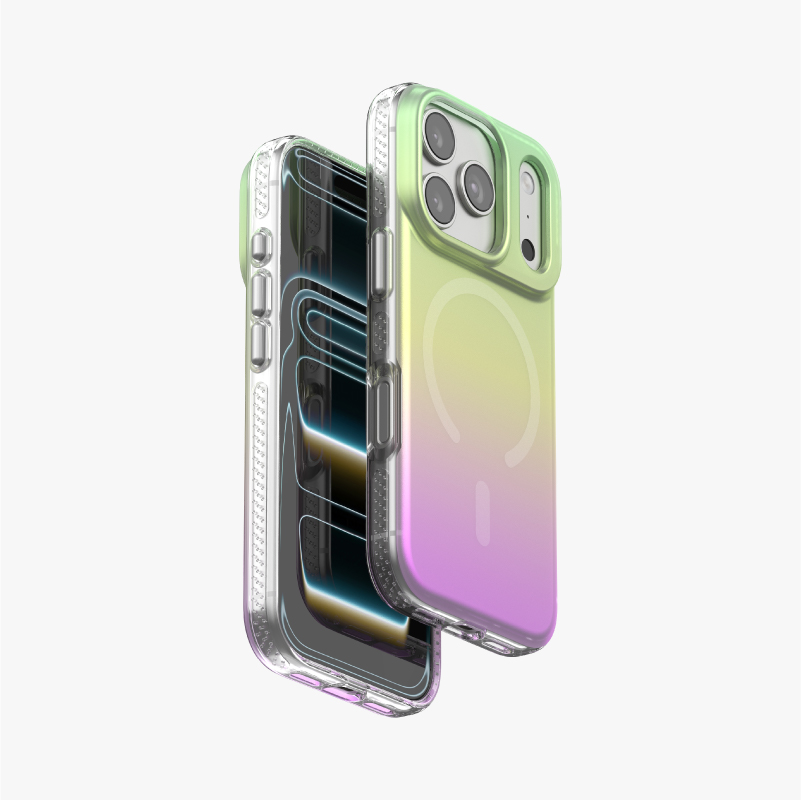 The P-25033 introduces the next evolution of style and protection with its third-generation gradient electroplating technology. Featuring an acrylic backplate that captures flowing metallic hues, it delivers a dynamic color-shift finish that changes gracefully with every angle — modern, vibrant, and unmistakably premium. Built with MagSafe-compatible wireless magnetic charging, the case ensures seamless power connection without compromising its sleek profile. The transparent TPU frame with subtle white micro-dots enhances grip while maintaining clarity and durability. Through precision electroplating and seamless bonding processes, each surface achieves a refined metallic gradient with superior scratch resistance and lasting brilliance. The P-25033 is more than protection — it’s a statement of sophistication and motion.